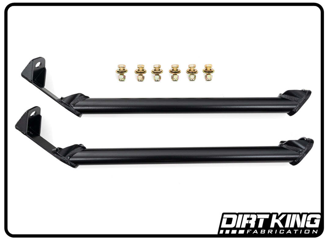 The Dirt King bed supports with integrated whip mounts were designed to keep the factory truck bed rigid while off roading and prevent splitting the seams. They're fabricated from 1/8â steel and includes all necessary hardware for the install.