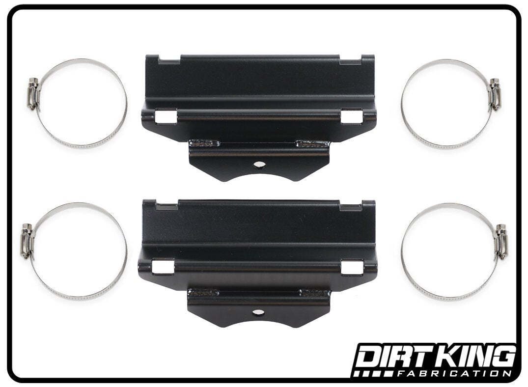 The Dirt King reservoir mounts are designed to bolt in above the coil buckets. This product eliminates the need to weld on reservoir tabs. The bolt on reservoir mounts were developed for the Dirt King long travel kit but can also be used for variety of custom applications.
