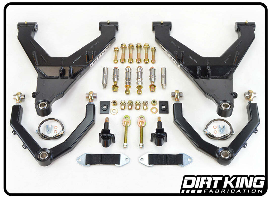 The Dirt King long travel kit was developed to drastically improve the vehicles off-road handling without compromising its day to day driving characteristics. This suspension system allows for 13.5â of travel and accepts up to a 37â tire. The kit is compatible with 2WD models and 4WD models along with the purchase of extended axle shafts. Our upper and lower arms are designed with 1â stainless steel uniballs for the outer pivots instead of ball joints for strength and increased articulation. This kit is the first of its kind, itâs a complete bolt on application with no cutting or welding to the frame on 4WD models. The suspension system was originally developed for Ram Trucks new concept vehicle, the Ram Rebel TRX which was released in mid-2016. After its amazing performance we decided to put the kit in production and make it available to the public!