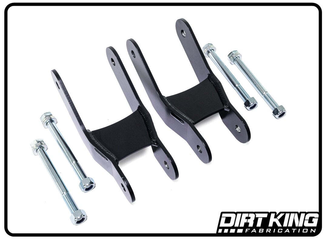 he Dirt King long travel shackles were developed for maximum down travel when paired with Deaver I96 springs. They are CAD designed and constructed using 3/16" thick steel. The shackles have a durable black powder coat and include 10.9 mounting hardware.