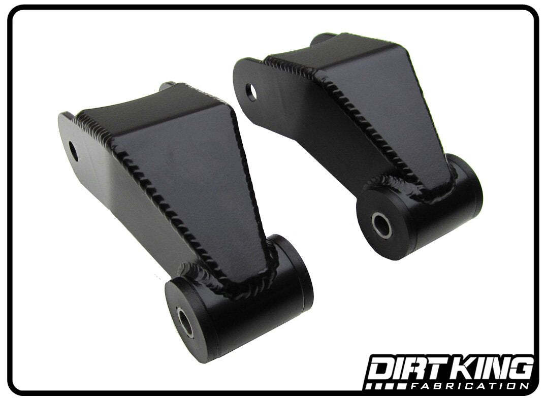 The Dirt King long travel shackles are a great upgrade to replace the factory shackles which are prone to failing. The shackles allow for additional down travel when paired with long travel leaf springs. They are CAD designed and constructed using 3/16" thick steel. The shackles drop the rear ride height ¾â to help level the vehicle. They also have grease ports to easily service the bushings.
