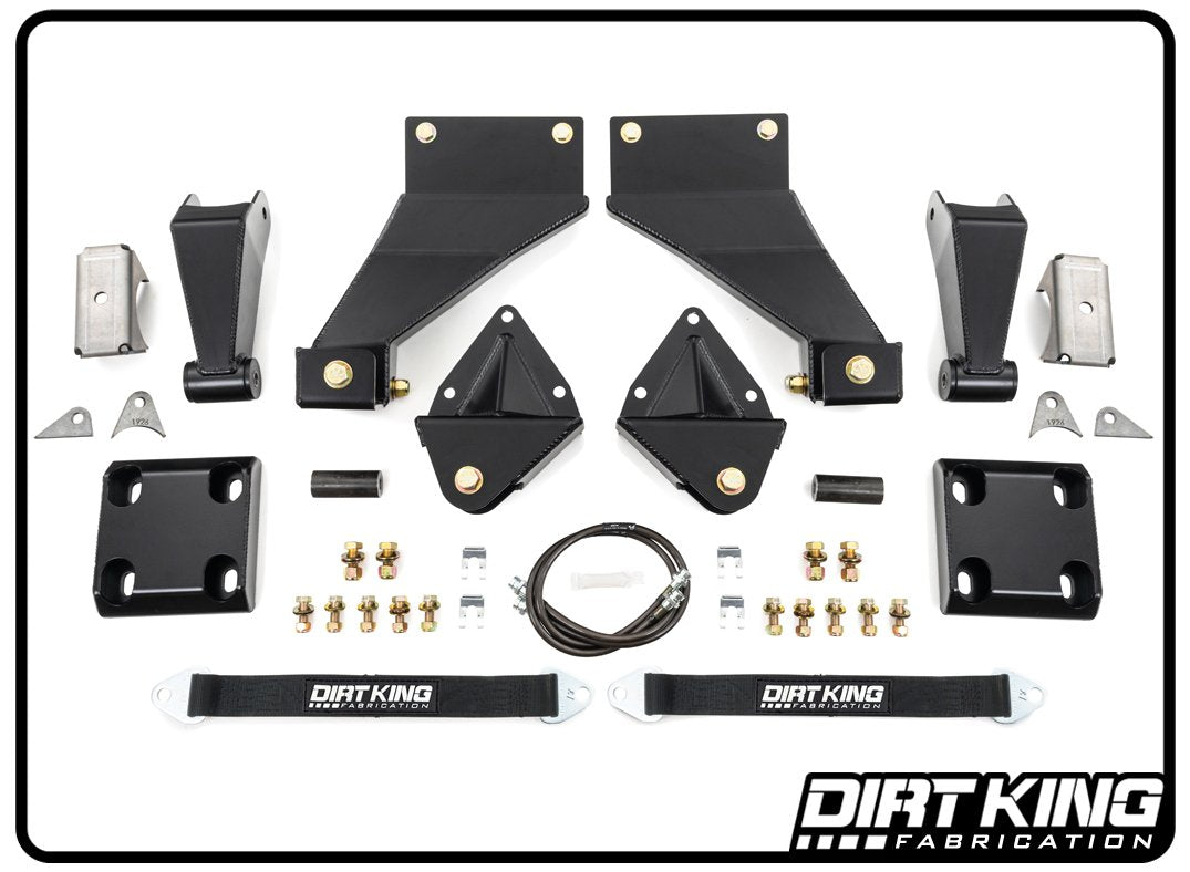The long travel spring under kit was designed for maximum rear suspension performance without making the installation difficult for average person. For best results this kit should be combined with the Dirt King bedcage and Deaver H70HD leaf under springs. The complete package paired with a custom drive shaft allows for 18" of usable travel. The factory drive shaft can be retained but will limit 2" of down travel. Even with the 2" travel loss it still achieves a respectable 16" of wheel travel.