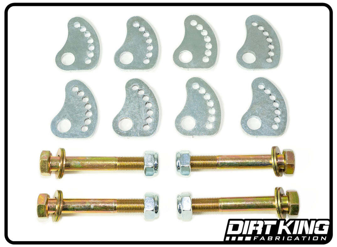 The Dirt King alignment cams are the strongest of its kind on the market. Included are eight alignment cams laser cut from 3/16" thick steel and four 10.9 bolts. The cams are designed with seven alignment holes to keep the alignment locked in place.