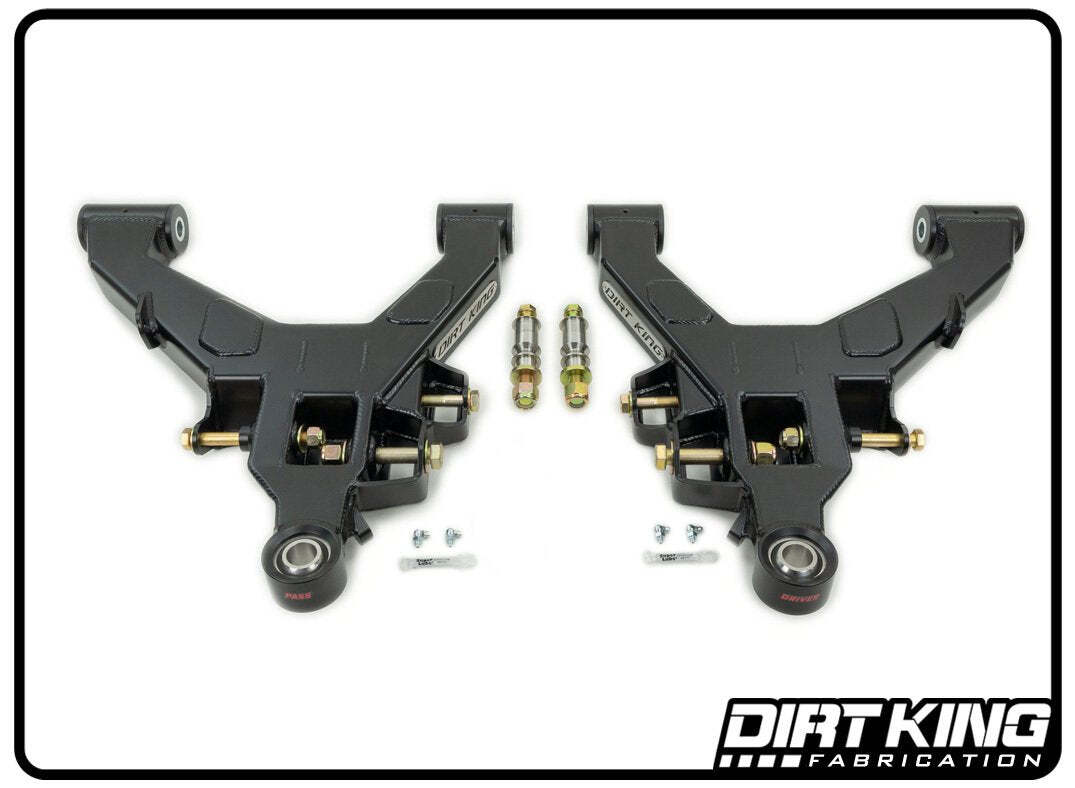 The Dirt King performance lower control arms were developed to increase the vehicle's off road performance without compromising its on road driveability. These arms are remarkably stronger than the factory lower arms to withstand the abuse seen while off roading. If there's any major contact to damage the arm the internal ribbed design keeps the crucial parts intact so your not left stranded on the trail.