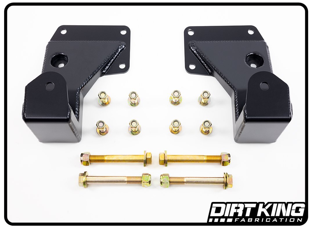 The Dirt King rear shackle hangers are designed to pair with the Dirt King long travel shackles for increased wheel travel. These hangers are fully fabricated making them more rigid compared to the factory hangers. The Dirt King hangers mount to the factory location on the vehicle while relocating the shackle pivot for improved leaf spring geometry.