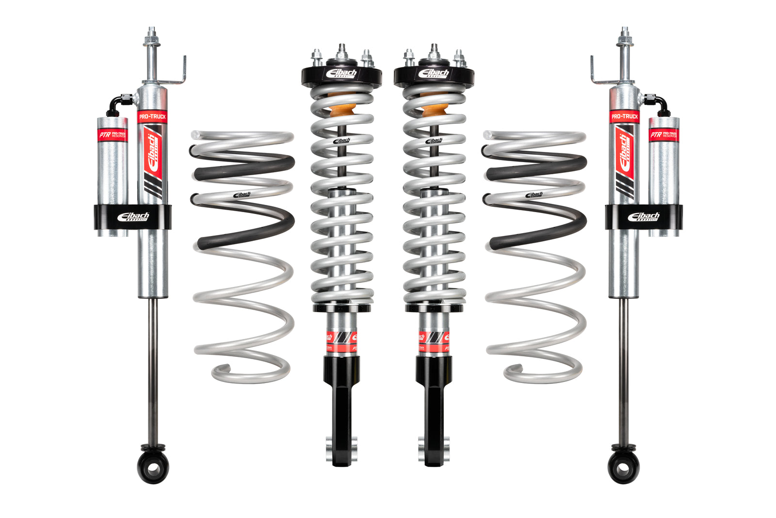 Stage 2 system featuring Pro-Truck-Coilover 2.0's + Pro-Truck Reservoir Sport Shocks Height Adjustable Front Coilover and External Reservoir Rear Shocks for Increased Off-Road Performance Anodized 6061-T6 Billet Aluminum Coilover Mounts, 46mm Piston, Monotube Design with Nitrogen Filled Variable Force Valving. Individually Dyno Tested for Matched Performance and Reliability. Heavy Duty Bushing System also Cycle Tested. Engineered, Tested and Manufactured by Eibach in the U.S.A. EIBACH E86-82-105-02-22 & E86-82-105-02-22/01 PRO-TRUCK COIL OVER SYSTEM RESERVOIR. Pair of Front Coilovers + Rear Reservoir Shocks FITS TOYOTA 2024 to 2025 Tacoma SR5, TRD SPORT, TRD Off-Road, Limited DOUBLE CAB 4WD N400 2.4L Turbo. Excludes leaf spring, and Adaptive Variable Suspension (AVS) models +0.5"-2.5", +1"