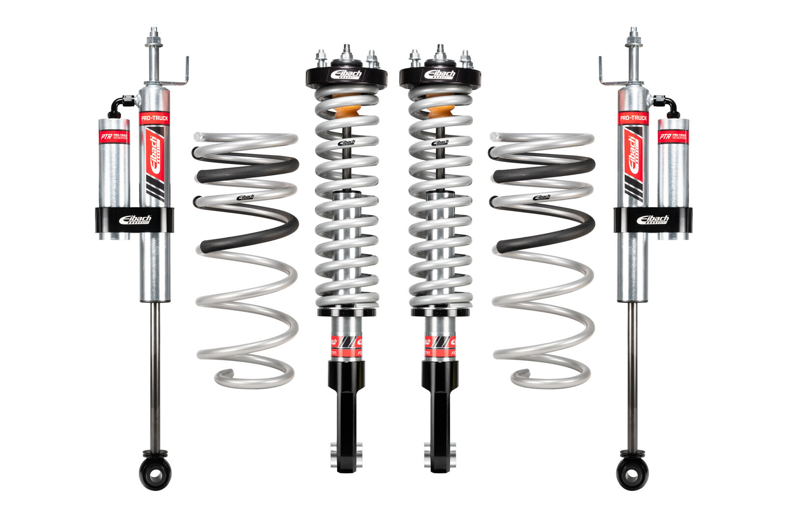 Stage 2 system featuring Pro-Truck-Coilover 2.0's + Pro-Truck Reservoir Sport Shocks Height Adjustable Front Coilover and External Reservoir Rear Shocks for Increased Off-Road Performance Anodized 6061-T6 Billet Aluminum Coilover Mounts, 46mm Piston, Monotube Design with Nitrogen Filled Variable Force Valving. Individually Dyno Tested for Matched Performance and Reliability. Heavy Duty Bushing System also Cycle Tested. Engineered, Tested and Manufactured by Eibach in the U.S.A. EIBACH E86-82-105-02-22 & E86-82-105-02-22/02 PRO-TRUCK COIL OVER SYSTEM RESERVOIR. Pair of Front Coilovers + Rear Reservoir Shocks FITS TOYOTA 2024 to 2025 Tacoma SR5, TRD SPORT, TRD Off-Road, Limited DOUBLE CAB RWD N400 2.4L Turbo. Excludes leaf spring, and Adaptive Variable Suspension (AVS) models +1.5"-3.0", +1"